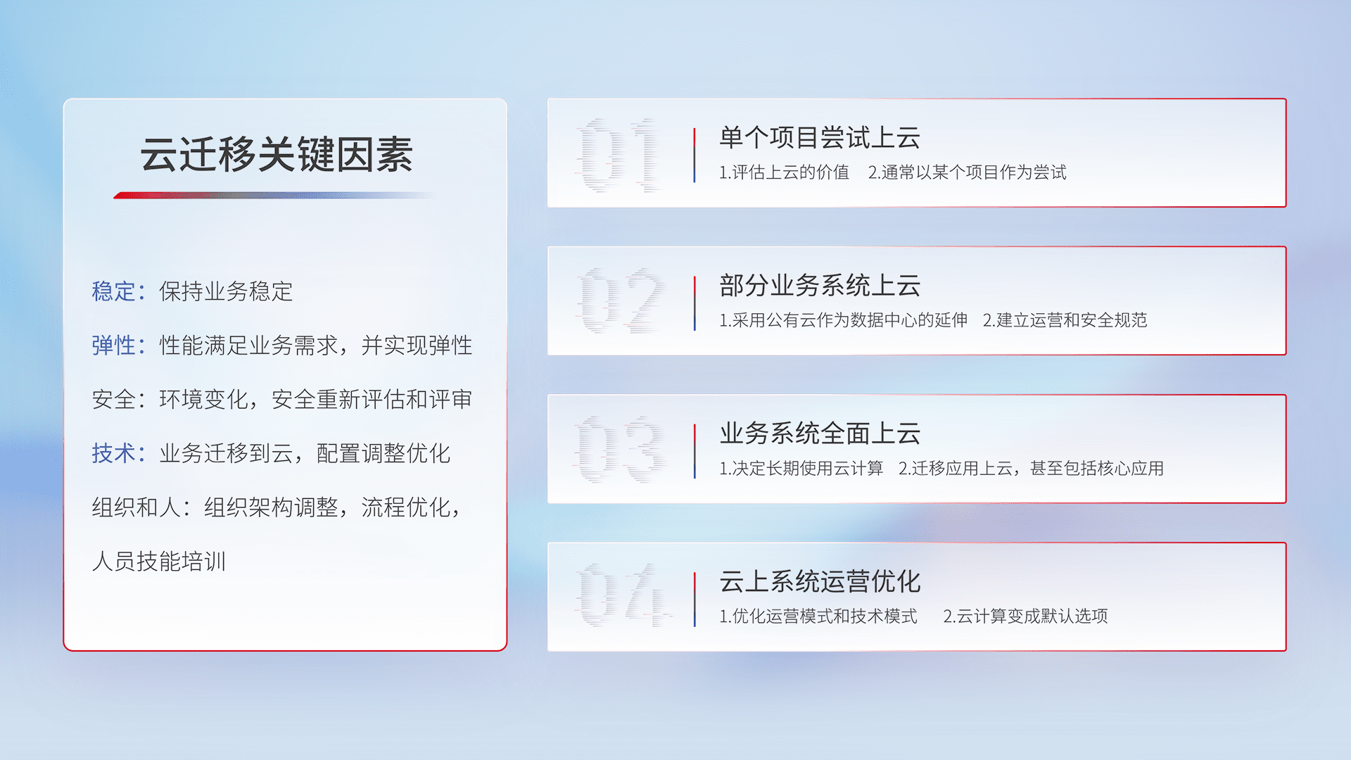 结合实际业务,,从规划设计、、、云平台选型、、、、云原生改造、、、数据迁移、、集成交付,,,迁移全过程为客户识别最佳上云路径,,,,做好风险识别管理,,,设计网络架构、、、、身份权限、、、、安全审计合规、、操作审计、、日志审计、、监控告警策略、、、多站点容灾设计等,,对云上基础设施进行整体规划,,,,提升IT治理水平,,,,以满足弹性、、、、高可用、、高性能的需求。。