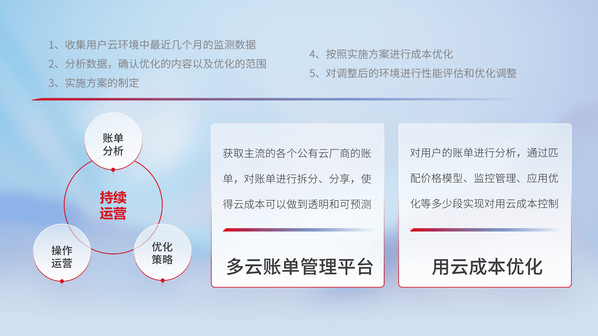 通过多云纳管,,以统一的资源数据模型把客户的云资源进行抽象和封装,,进而实现对多云资源的统一操作,,,保障云资源管理的可靠性、、、稳定性与可用性。。。量身定制化运维内容,,,,配置、、、开发运维、、、、补丁管理、、、备份、、、、监控、、、认证和访问管理、、审计和日常巡检等,,保障在用云过程中的可靠度,,,,稳定度以及高可用率。。。。