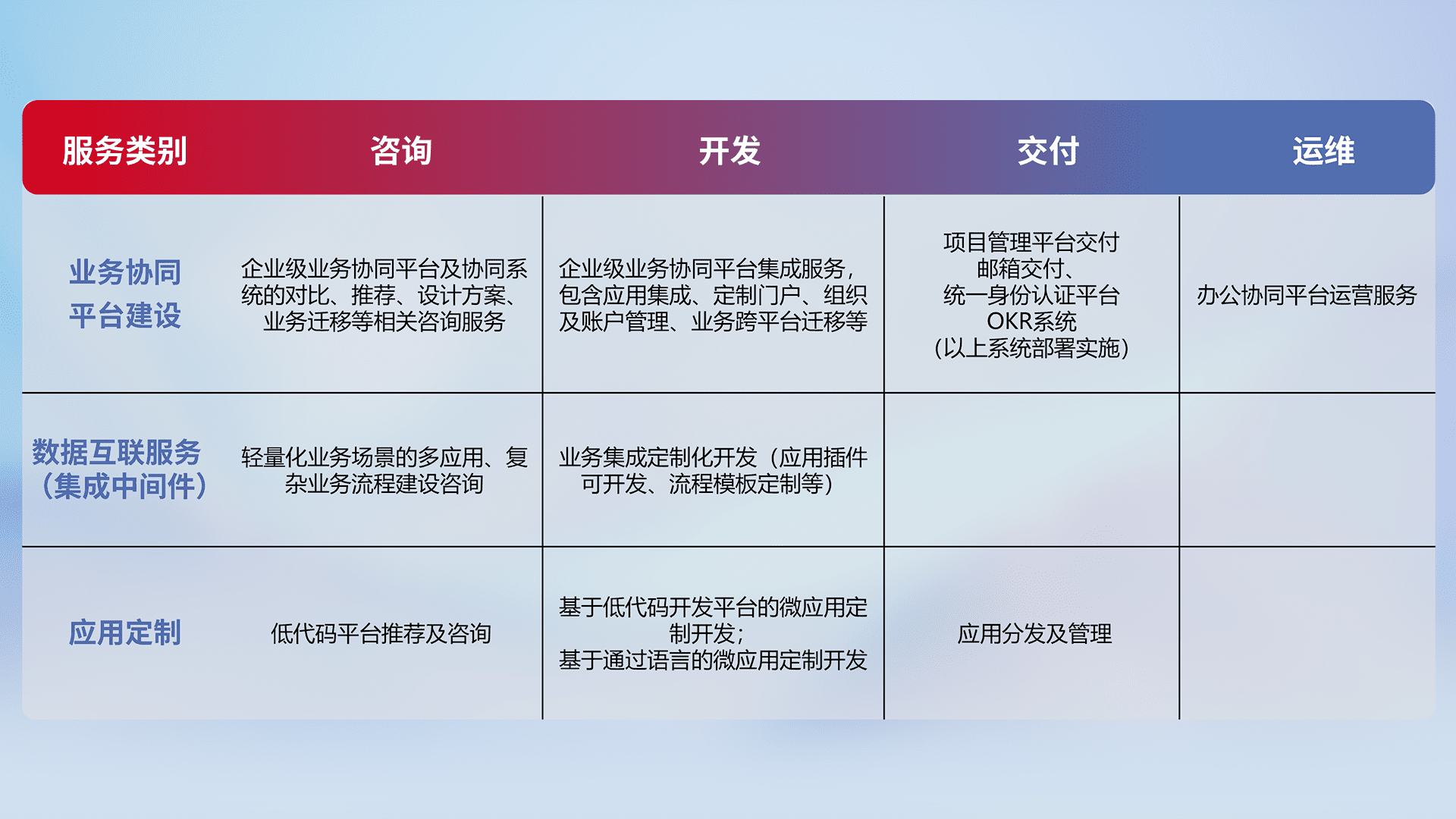 针对钉钉、、、、企微、、IDaas等平台级产品提供产品的规划、、方案、、交付、、、定制化开发等服务,,,,实现如统一协同办公、、、智能客户服务、、、混合会议管理、、、智能数据查询、、、等业务场景,,,,实现数字化转型。。。。